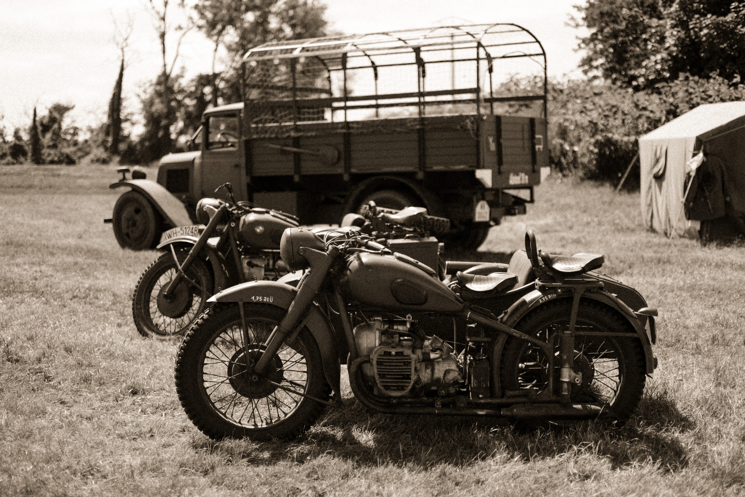 Imaginez le passage de nos Citroën U23, l’allure indémodable de nos side-cars en colonne, ou la silhouette caractéristique du Stoewer. Notre engagement va jusqu’au bout du détail avec des pièces d’artillerie comme le PaK 36 ou le Panzerbüsche.